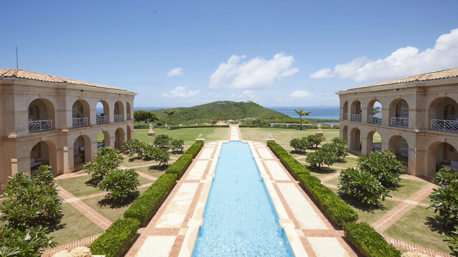 Sweeping loggias wrap around each side of the property with a central temple façade setting an impressive tone but still allowing guests to enjoy warm Caribbean breezes and immerse themselves in the glorious, tropical surroundings. The villa's main swimming pool is quite simply spectacular. The nine palatial bedroom suites, many with private verandas and vast ensuite bathrooms, are alive with ornate, hand painted murals by French artist Jean-Claude Adenin and exquisite wallpapers. The gilded furniture , classical screens and interior design choices seen throughout the house are reminiscent of Versailles or the great palazzos of Lake Como.